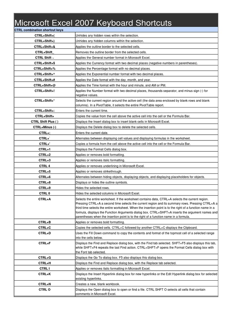 Microsoft Excel 2007 Keyboard Shortcut | Microsoft Excel ...