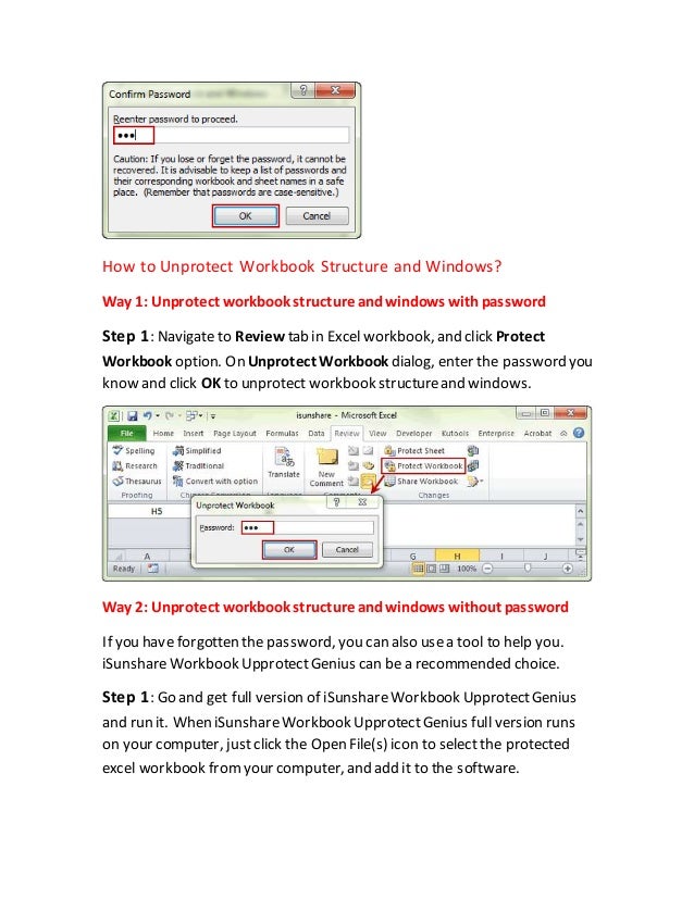 Unprotect Excel workbook or unprotect Excel worksheets when you do not have the password, crack an Excel password to unprotect the worksheets I recently inherited some Excel spreadsheets to modify which had protected workbooks and worksheets, but an unprotected VBA project.