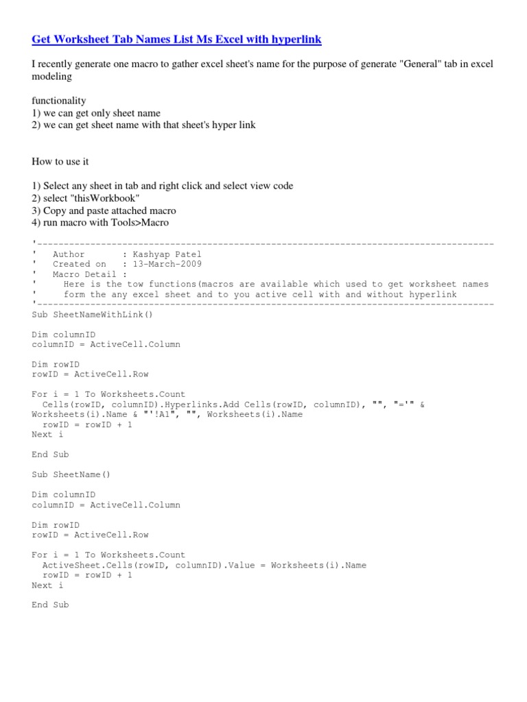 Get Worksheet Tab Names List Ms Excel With Hyperlink